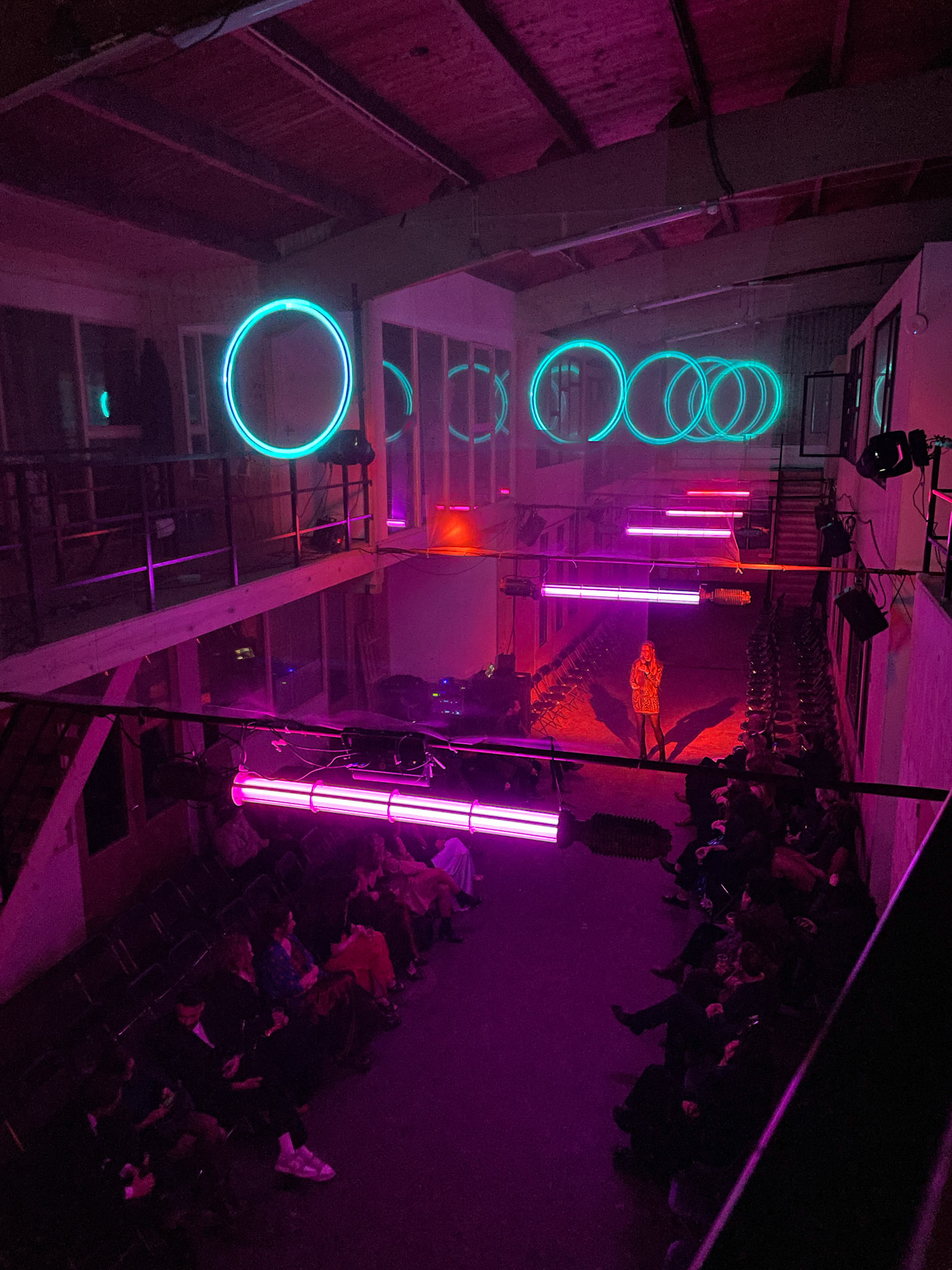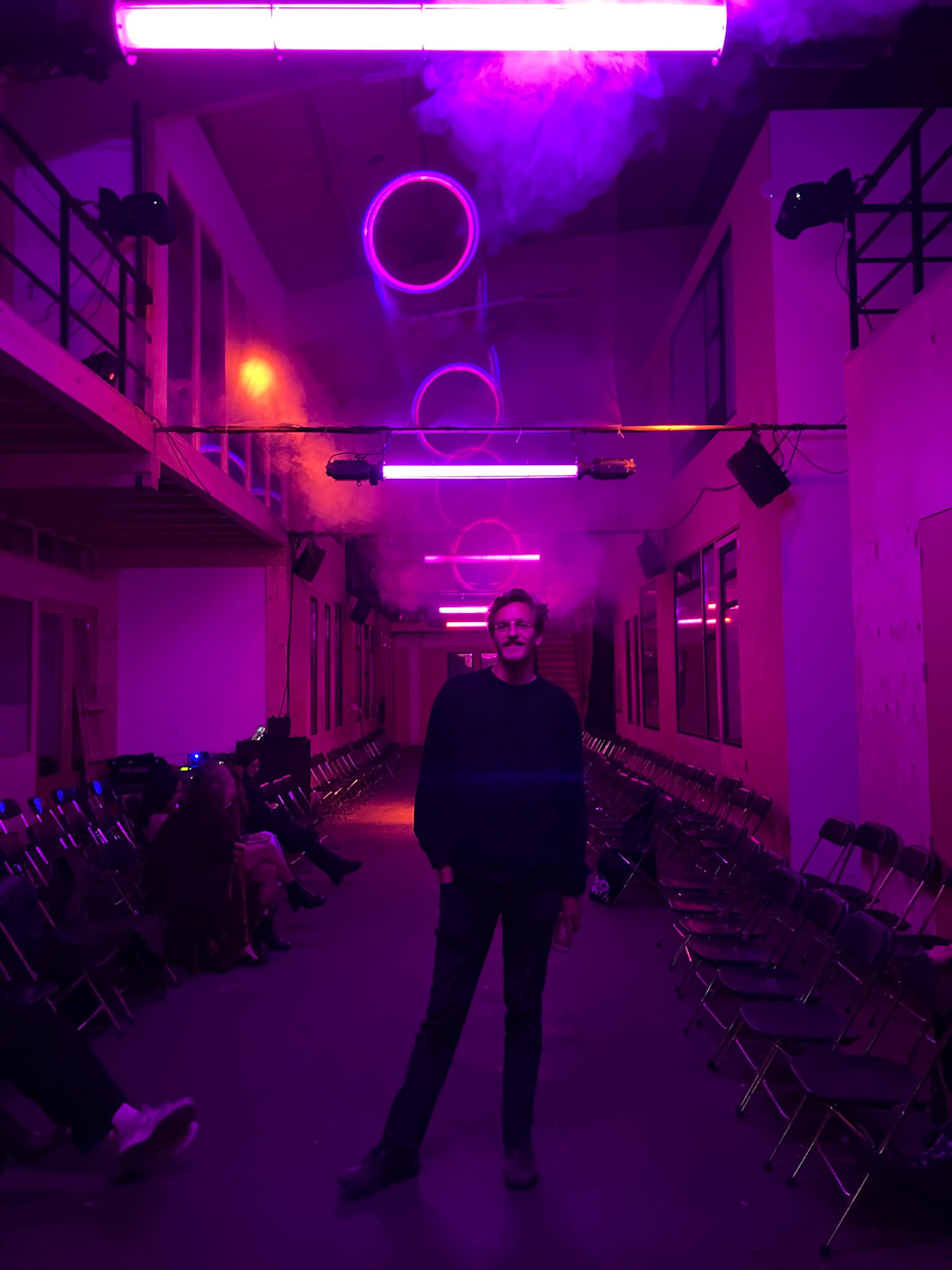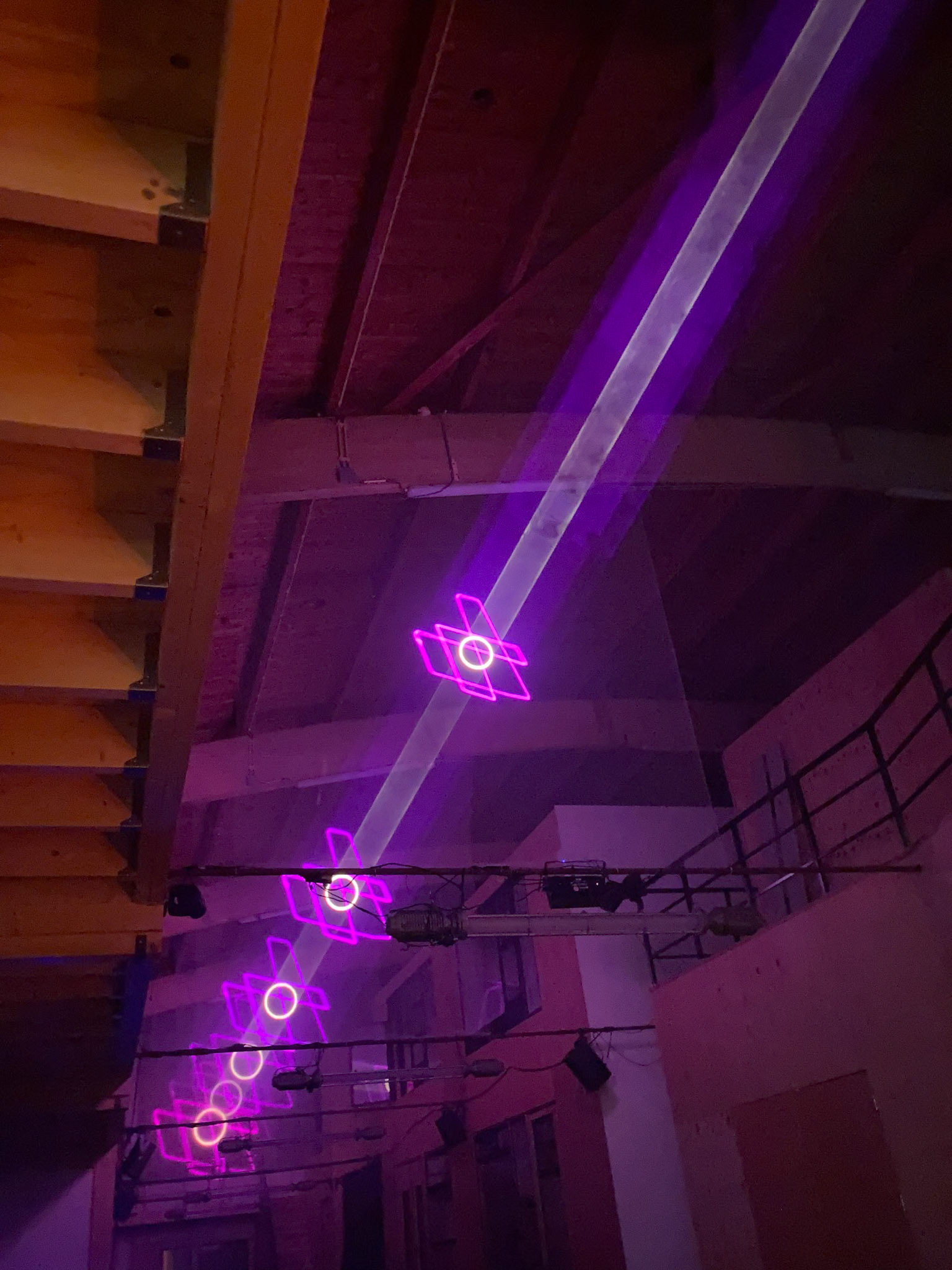 For the Vrijheidsbal by De Nachtburgemeester of Amsterdam I was asked to create laser projections at their show. In the long hallway above the catwalk, I mounted 5 layers of semi-transparent mesh that partially reflect the light. This created holograms over the length of the hallway.