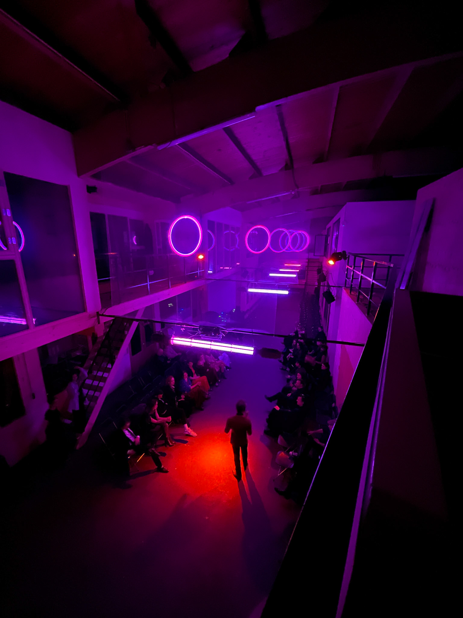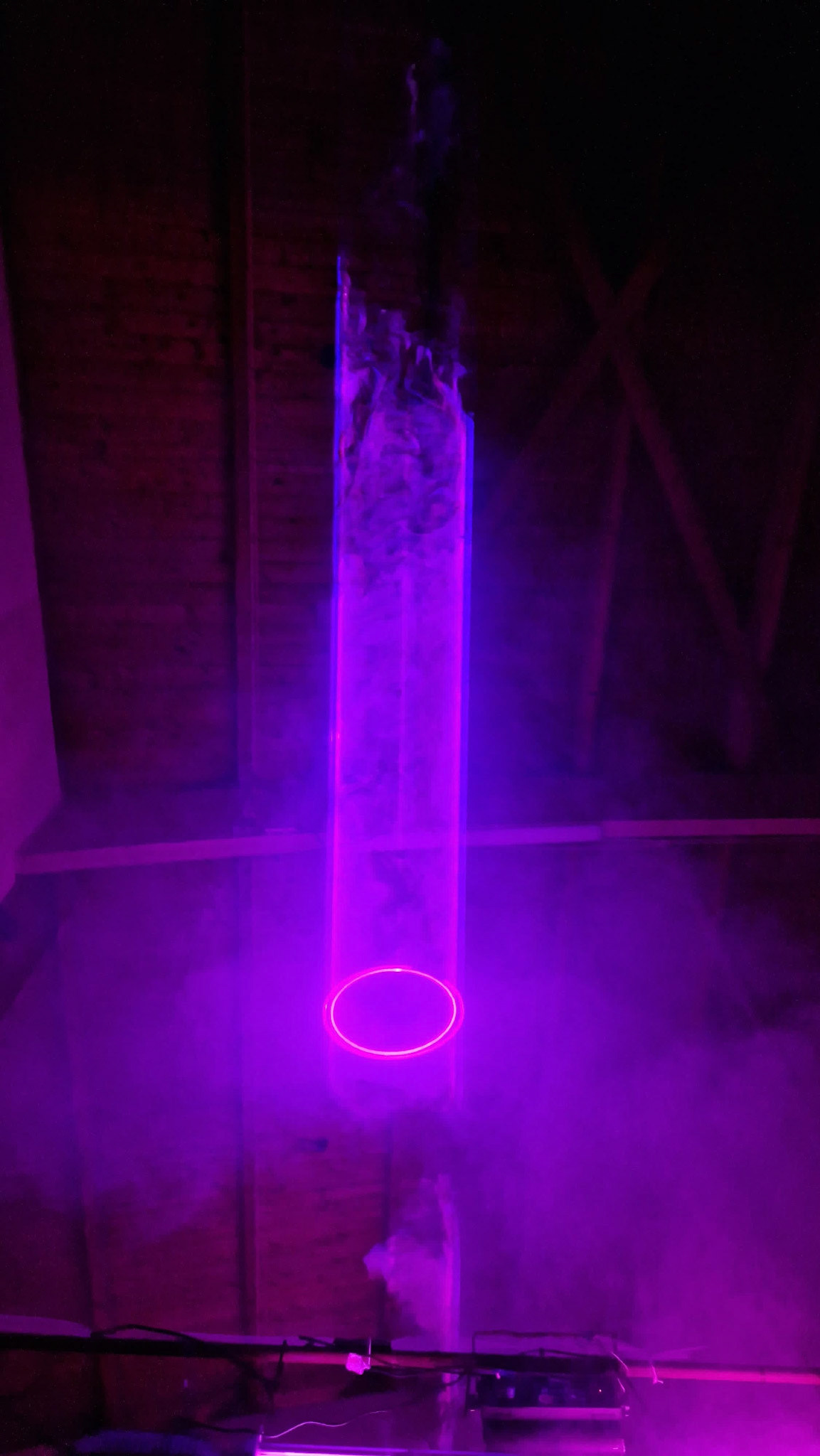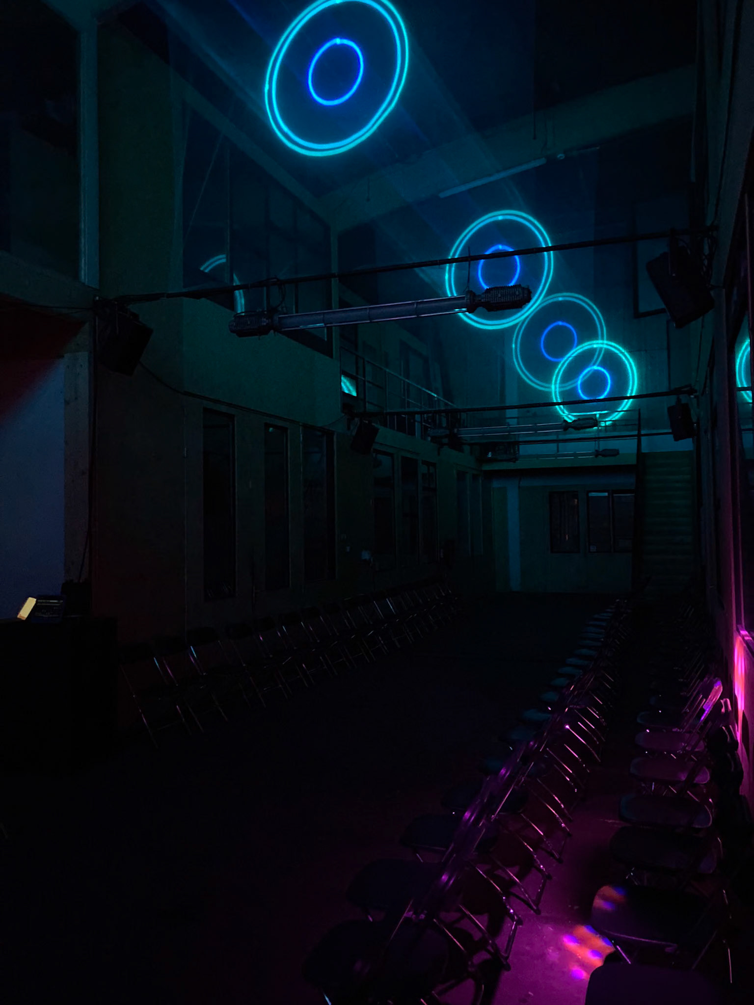 For the Vrijheidsbal by De Nachtburgemeester of Amsterdam I was asked to create laser projections at their show. In the long hallway above the catwalk, I mounted 5 layers of semi-transparent mesh that partially reflect the light. This created holograms over the length of the hallway.